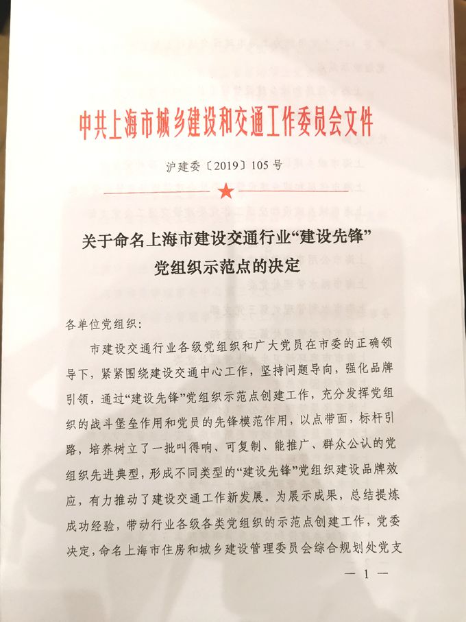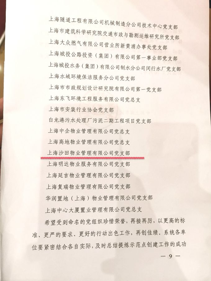 2019年6月,沙田物業(yè)黨支部被中共上海市城鄉(xiāng)建設(shè)和交通工作委員會授予“建設(shè)先鋒”示范點(diǎn)稱號。